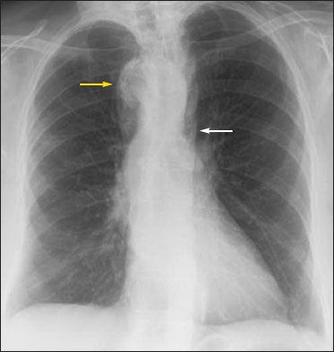 Figure 1 – A chest radiograph showed the absence of an aortic knuckle (white arrow) and a right-sided aortic arch (yellow arrow).