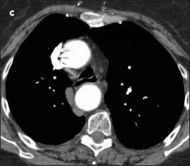 In infancy, symptoms are related to congenital heart anomalies or to compression of mediastinal structures, such as the trachea or esophagus. In adulthood, symptoms may include dysphagia, dyspnea, stridor, wheezing, cough, choking spells, recurrent pneumonia, obstructive emphysema, or chest pain and are more often the result of early atherosclerotic changes of the anomalous vessels, dissection, or aneurysmal dilatation with compression of surrounding structures.7