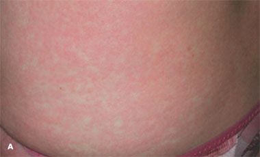 Acute infection is characterized by fever; headache; myalgias; and a subacute, bilateral polyarthralgia that typically affects the distal joints of the fingers, toes, ankles, and wrists.5 Rash is frequently observed; among 47 French patients returning from the Indian Ocean islands with CHIKV infection, 24 noted an evanescent pruritic rash over the face, trunk, or extremities accompanied by edema (Figure 1).6 Among 46 persons in this group of travelers, less common clinical manifestations were bilateral conjunctivitis in 2 patients (4%) and large joint effusions in 7 patients (15%). Common laboratory findings include elevation of liver and muscle enzyme levels, mild thrombocytopenia, and leukopenia. Hematological abnormalities in the acute phase may be associated with bleeding. Affected patients may suffer from a protracted illness characterized by persistent polyarthralgias and a limited ability to perform activities of daily living. Tenosynovitis also may exacerbate these late-stage symptoms.6,7