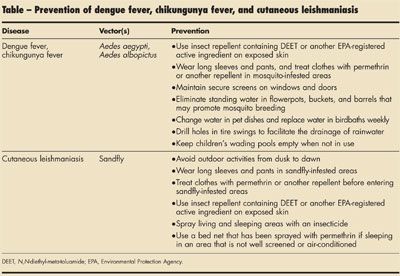 CHIKV infection should be a consideration in travelers with fever and arthralgias who have recently returned from areas where CHIKV is transmitted. Acute- and convalescentphase serum specimens can be submitted to the CDC for testing through state health departments. Unfortunately, no vaccine or specific antiviral treatment exists. Therapy consists of supportive care, including rest, fluids, and antipyretics. Late-stage symptoms have demonstrated a dramatic response to short-term corticosteroid therapy. The CDC suggests that infected persons should be protected from further mosquito exposure by staying indoors or under a mosquito net during the first few days of illness, thus limiting propagation of the transmission cycle.12 Recommendations for prevention are detailed in the Table.