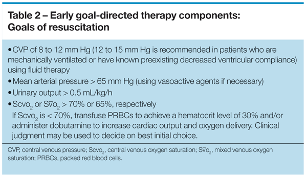 Resuscitation goals for the initial 6 hours included a central venous pressure of 8 to 12 mm Hg, mean arterial pressure (MAP) greater than 65 mm Hg, urinary output greater than 0.5 mL/kg/h, and an ScvO2 or SvO2 of greater than 70% or 65%, respectively. If ScvO2 was less than 70%, packed red blood cells (PRBCs) were transfused to achieve a hematocrit level of 30%. If central venous pressure, MAP, and hematocrit were optimized and ScvO2 remained less than 70%, dobutamine was added to increase cardiac output and oxygen delivery (Table 2).