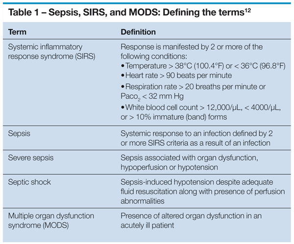 The diagnosis of sepsis can still be perplexing despite a well-accepted consensus definition. In 1992, the American College of Chest Physicians/Society of Critical Care Medicine consensus conference arrived at the current definition of sepsis as a systemic inflammatory syndrome (defined by a change in 2 or more abnormal clinical findings: temperature, heart rate, respiration rate, and white blood cell count) with a concomitant pathological infection (Table 1).12