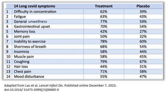 Results reported by Lau and Su and colleagues showed greater improvement among those in the treatment group vs those receiving placebo on all 14 long COVID symptoms. The results by proportion of patients whose long COVID symptoms were relieved: