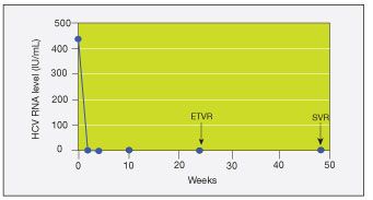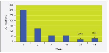 The patient was referred to Mount Sinai Medical Center, New York, for evaluation and possible treatment for acute hepatitis C. His HCV RNA level was initially 1,700,000 IU/mL and ALT level was 389 U/L (normal, 3 to 60); his treatment for HIV infection was stopped. After 12 weeks of observation, his HCV RNA level dropped significantly without treatment. However, the patient had not spontaneously cleared the virus, and his ALT level remained elevated. New treatment was begun with pegylated interferon alfa 2a 180 µg/wk and ribavirin 800 mg/d.