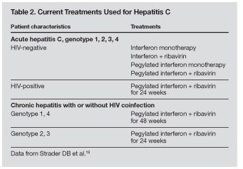 Treatment of acute hepatitis C with interferon monotherapy in HIV-negative patients has demonstrated SVR rates of 90% to 98%.6 Currently, there are no standard guidelines to determine when to initiate treatment, what type of interferon to use, or if ribavirin is required for treatment of acute hepatitis C. The various treatments being used today are shown in Table 2 and are based on guidelines for treating chronic hepatitis C issued by the American Association for the Study of Liver Diseases.18 Treating chronic hepatitis C in HIV-negative patients has resulted in an SVR of 55% after 48 weeks of pegylated interferon and ribavirin.17 However, treatment of chronic hepatitis C in HIV-positive patients has revealed SVR rates of only 27% to 40%.17 Therefore, a comparatively lower SVR would be expected in HIV-infected patients with acute hepatitis C. For HIV/HCV-coinfected patients, recent reports recommend combination treatment with pegylated interferon and ribavirin for 24 weeks, regardless of the genotype.4,17,19