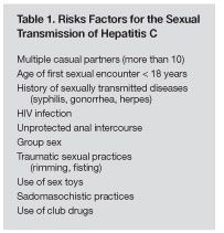 There has been an increased incidence of sexually transmitted hepatitis C among HIV-infected MSM who engage in high-risk, unprotected sexual behavior.4 These sexual practices include unprotected insertive and receptive anal intercourse, rimming, fisting, and oral sex.13 Other reasons for the increased risk of sexual transmission of hepatitis C include having had multiple casual partners (ie, more than 10 lifetime sexual partners) (Table 1).13