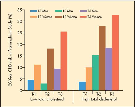 Regarding the lipid ratio, it is apparent from Framingham Study data that coronary heart disease (CHD) risk is strongly linked to the total/HDL cholesterol ratio-whether or not either the total or the LDL cholesterol level is high.1 A total/HDL cholesterol ratio of 2.5 is, taken alone, highly favorable.