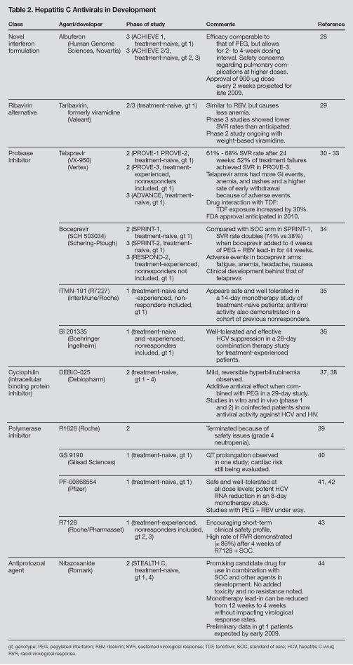 27. Thompson A, Patel K, Tillman H, McHutchison JG. Directly acting antivirals for the treatment of patients with hepatitis C infection: a clinical development update addressing key future challenges. J Hepatol. 2009;50:184-194. www.ncbi.nlm.nih.gov/pubmed/19022518. Accessed December 14, 2008.
