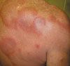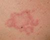 A 31-year-old white woman presents with an erythematous skin eruption of 2 weeks' duration that consists of papules on the cheeks and several disk-shaped papules and plaques on the back (Figure 1), posterior neck, and right upper anterior chest. The lesions have erupted episodically over the past 2 years. They initially appear on the back or face and then spread centrifugally to form rings.