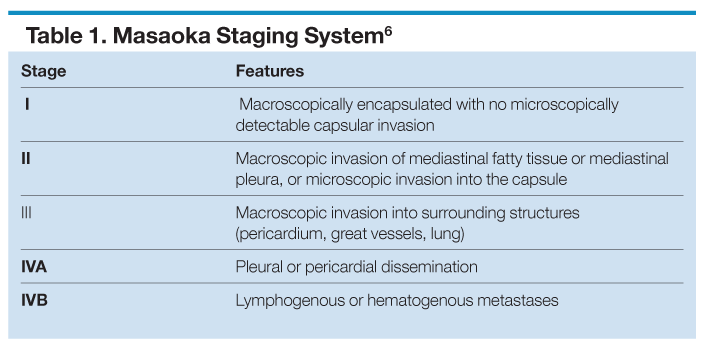 A thoracic CT scan and tissue samples are important in determining the stage of the disease using the Masaoka staging system (Table).6 Stage I malignant thymoma demonstrates encapsulation without microscopic capsular invasion, and stage II disease involves invasion of mediastinum or microscopic capsular invasion.6 In stage III malignant thymoma, there is invasion into surrounding structures, including the pericardium, great vessels, and lung.6 Stage IVA malignant thymoma involves pleural or pericardial metastases, and stage IVB disease includes lymphogenous or hematogenous metastases.2,6