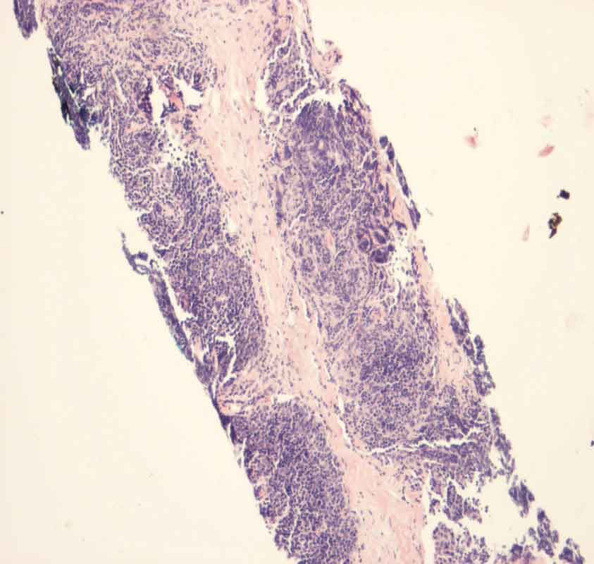 A tissue sample is required for making the diagnosis of malignant thymoma and for ruling out other possible diagnoses, such as lymphoma and thymic carcinoma. Peripherally located lesions can be accessed via CT-guided core biopsy, whereas centrally located tumors may be approached via bronchoscopy or mediastinoscopy. Histolological features consist of a mixture of keratin-positive neoplastic epithelial cells and lymphocytes subdivided by fibrous bands.