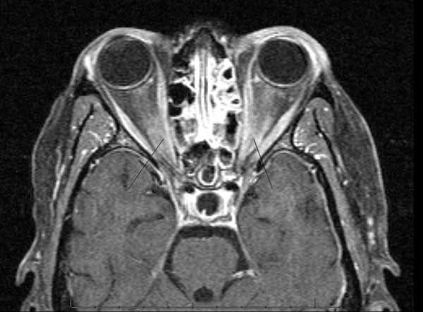 Figure. This axial T1-weighted MRI scan after intravenous injection of gadolinium shows marked signal enhancement of both optic nerves, indicating disruption of the blood-nerve barrier and optic neuritis.