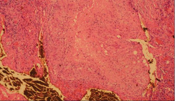 Figure 1 - This lymph node biopsy specimen from a patient with typical catscratch diseasedemonstrates the classic necrotizing granulomatous process. (Courtesy of Missouri Delta MedicalCenter, Departments of Pathology and Surgery.)