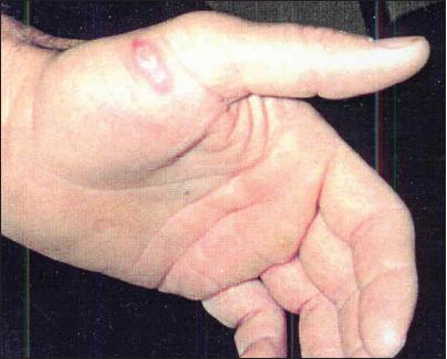 Figure 2 - A typicalulcerative lesion thatresulted from akitten bite is shownon the hand of thispatient. A round,red-brown, nontenderpapule, from 1 toseveral millimetersdevelops in the areaof the lesion.