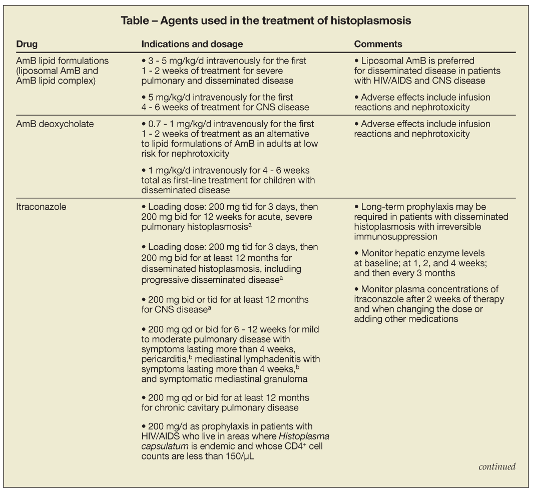 1. Wheat LJ, Freifeld AG, Kleiman MB, et al; Infectious Diseases Society of America. Clinical practice guidelines for the management of patients with histoplasmosis: 2007 update by the Infectious Diseases Society of America. Clin Infect Dis. 2007;45:807-825.