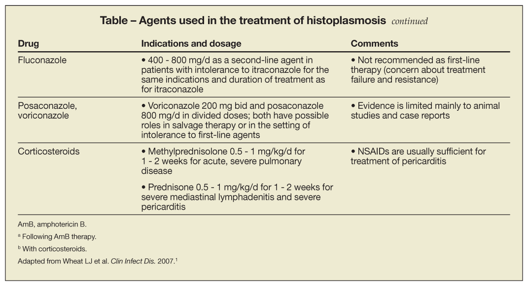 Histoplasmosis is caused by the dimorphic fungus Histoplasma capsulatum, which is endemic to the Ohio and Mississippi river valleys. It is associated with a variety of manifestations, and its severity ranges from asymptomatic infection to severe disseminated illness. Treatment is often based on the severity and site of the disease. Updated guidelines for the treatment of histoplasmosis have been published by the Infectious Diseases Society of America.1