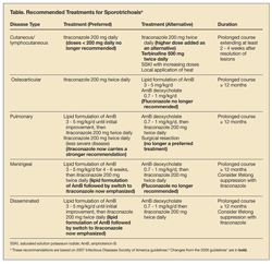 This finding is reflected in the updated guidelines, and fluconazole is no longer specifically recommended, except as an alternative treatment for cutaneous and lymphocutaneous disease. Ketoconazole is no longer recommended because of its inferior effectiveness and less favorable toxicity profile.8