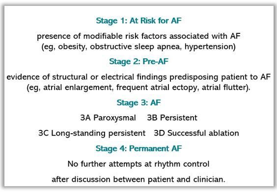 The guidelines, jointly published in the Journal of the American College of Cardiology and Circulation, for the first time provide a classification system for AF, the 4 stages reflecting the complexity of the condition and the need for a continuum of care that includes different strategies at different stages.