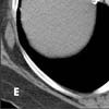 A CT image below the level of the heart (E) shows extensive venous collaterals that extend to the inferior vena cava (arrows). Venous collaterals extending to the inferior vena cava are also evident on another slice in the upper abdomen (F, arrows).