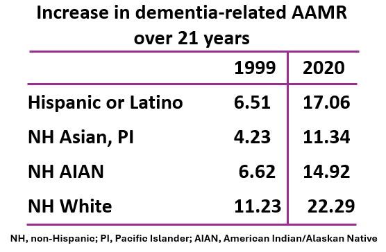 For the retrospective cohort analysis, Ali and fellow researchers tapped mortality data from the CDC’s Wide-Ranging Online Data for Epidemiologic Research (WONDER) database for individuals aged 35 to 85 years and older where the cause of death was listed as dementia/Alzheimer disease as a contributing or underlying cause of death. The designated time frame was 1999 to 2020. Mortality rates adjusted for age due to dementia were categorized by gender, racial and ethnic groups, and geography.