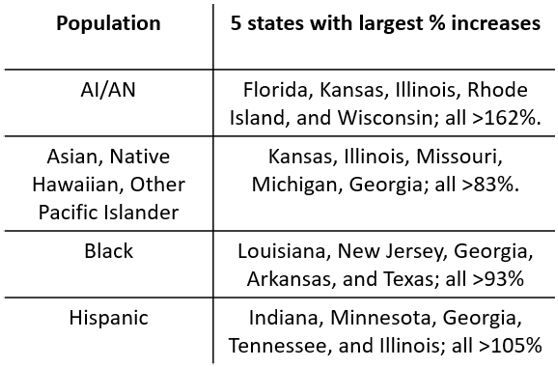 Median state MMRs increased also for the other 3 racial/ethnic groups examined in the study: Asian, Native Hawaiian, or other Pacific Islander: 9.6 to 20.9; Hispanic: 9.6 to 19.1; and White: 9.4 to 26.3.