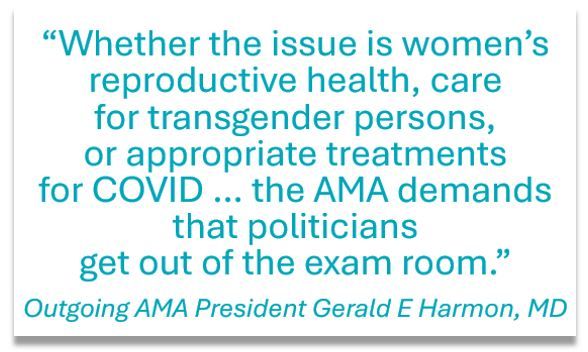“Whether the issue is women’s reproductive health, care for transgender persons, or appropriate treatments for COVID … the AMA demands that politicians get out of the exam room,” Harmon said in his speech.