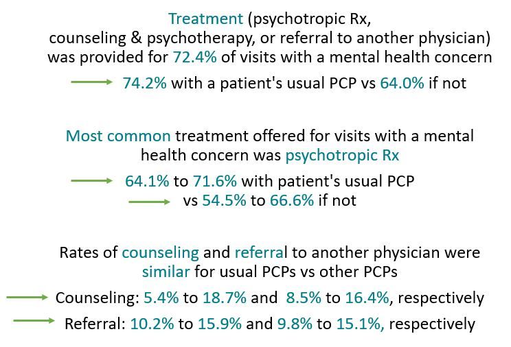 In addition to temporal trends in addressing mental health, Rotenstein et al also were interested in the characteristics of patients and visits that were associated with a greater likelihood of a mental health discussion, the specific mental health issues seen, and whether and what type of treatment was provided.