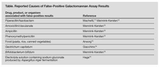 False-positive test results with the GM assay have been reported by a number of investigators (Table). Because Penicillium produces GM, it is not surprising that a number of -lactam antibiotics, including piperacillin/tazobactam, amoxicillin/clavulanate, ampicillin, and phenoxymethylpenicillin, have yielded positive Platelia EIA results.11,12