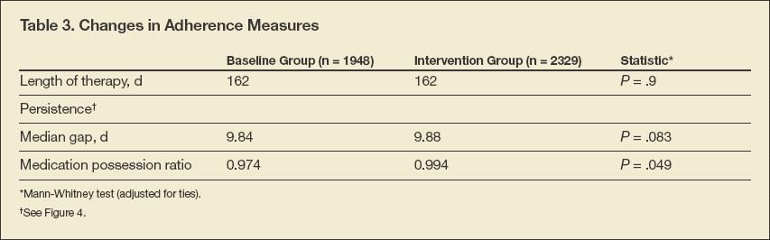 Adherence findings. Study findings are detailed in Table 3. Length of therapy was calculated by determining the number of days between the first day of new therapy and the final day of the last prescribed therapy. The average days of therapy were identical for both groups: 162 days.
