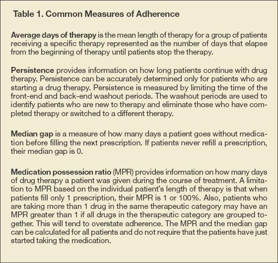 This study evaluated 4 common measures of medication adherence: average days of therapy, persistence, median gap, and medication possession ratio (MPR) (Table 1). These measures can be used to describe medication adherence for individual patients and patient groups.