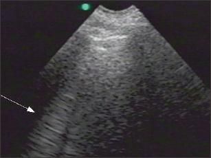 The comet tail artifact (arrow) is an example of a static sign that can be useful in excluding pneumothorax.