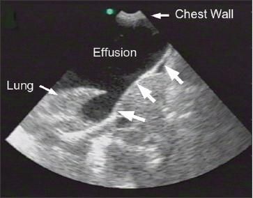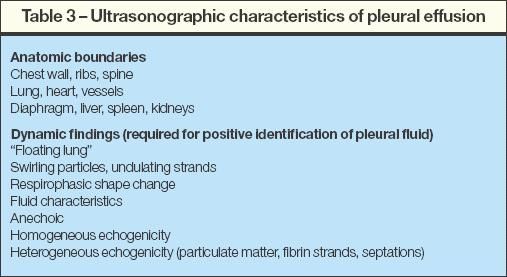A pleural effusion is usually suspected on the basis of findings from the physical examination or a standard chest radiograph. Sonography can be used to confirm the presence or absence of pleural effusion (Table 3).