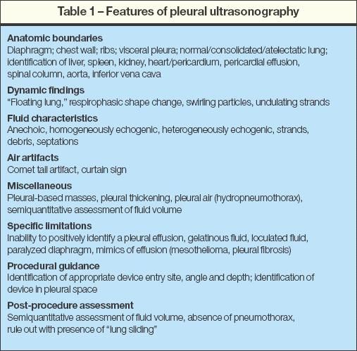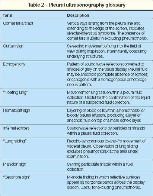 The primary challenges of pleural sonography are the identification of pleural effusion as well as the safe and successful performance of drainage procedures. Pleural ultrasonographic findings and uses are summarized in Table 1. A glossary of the relevant terms is presented in Table 2.