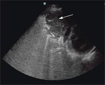 A pleuralbased left lung mass can be seen on this ultrasonogram (arrow). Ultrasonography can easily distinguish tumors from coexisting pleural effusion.