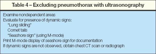 Ultrasonography is an efficient means of excluding pneumothorax when rapid diagnosis is needed or after interventions such as central line placement, lung or pleural biopsy, or thoracentesis (Table 4). The patient also may be spared additional radiation exposure.9