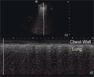 Because air accumulates in a nondependent manner, examination of the anterior chest of the supine patient is optimal for the exclusion of pneumothorax. Using this technique, the absence of lung sliding has a sensitivity that is comparable to the sensitivity of CT scanning. Documentation of lung sliding for the medical record can be accomplished by switching the ultrasound to motion mode (M-mode) and observing the "seashore sign" (Figure 4).