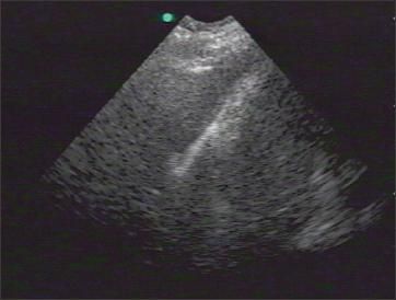 Figure 6 – Sonography allows for real-time imaging of the catheter tip or guidewire and is preferred to CT for unstable or uncooperative patients. Here, a J-wire is visualized after placement into the pleural space.
