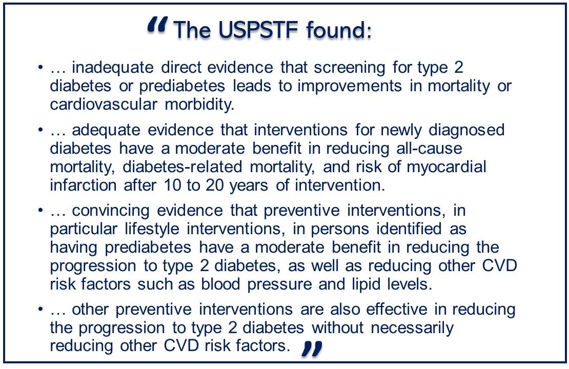 Evidence report: Jonas DE, Crotty K, Yun JDY, et al. Screening for prediabetes and type 2 diabetes: Updated Evidence Report and Systematic Review for the US Preventive Services Task Force. JAMA. 2021;326:744-760. doi:10.1001/jama.2021.10403