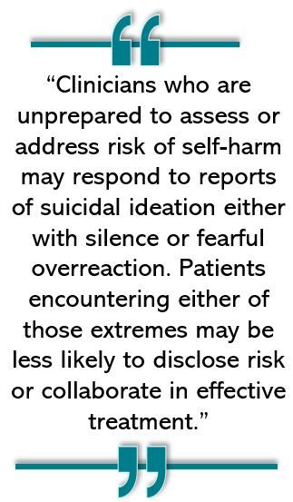 “Clinicians who are unprepared to assess or address risk of self-harm may respond to reports of suicidal ideation either with silence or fearful overreaction,” the authors said. “Patients encountering either of those extremes may be less likely to disclose risk or collaborate in effective treatment.”