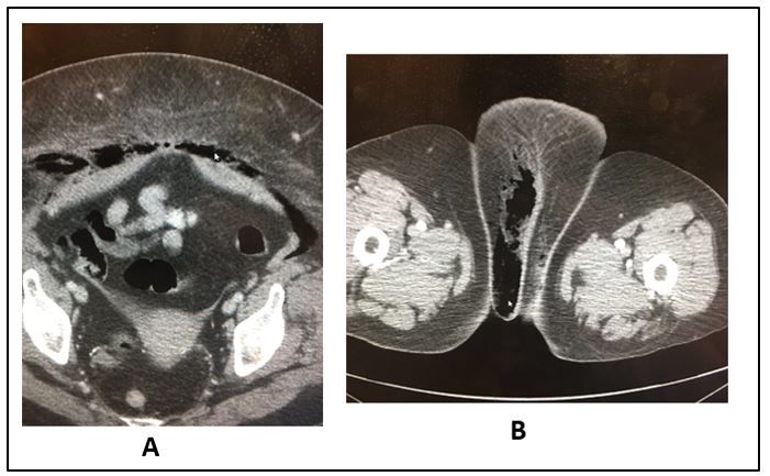Figure 2. CT scan pelvis (A); lower cut same scan (B)