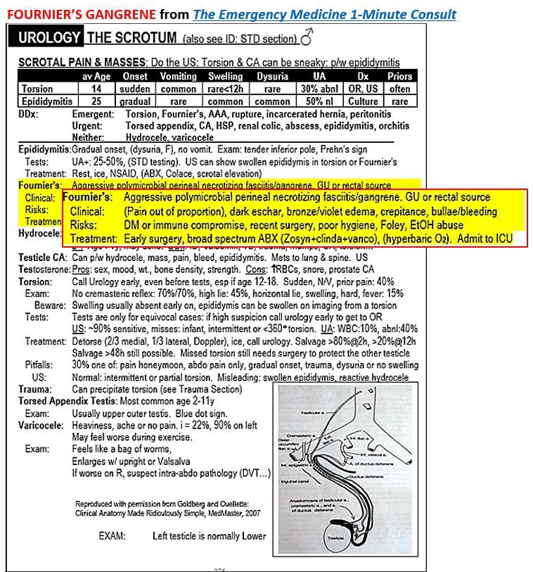 For additional information, please see full excerpt on Fournier's gangrene from The Emergency Medicine 1-Minute Consult pocketbook.