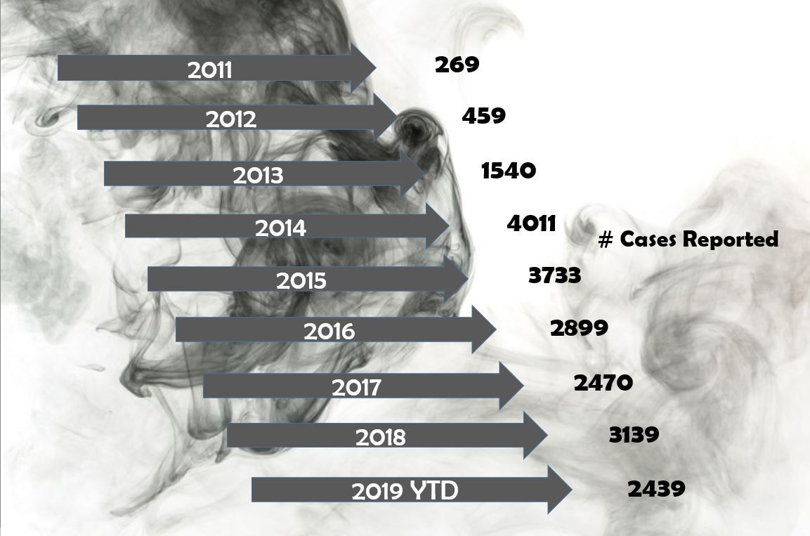 The American Association of Poison Control Centers reports that as of July 31, US poison control centers have managed 2439 exposure cases related to e-cigarette devices and liquid nicotine this year; this includes all ages. See image below for annual number of cases reported since 2011, the year in which poison control centers began to recieve calls about e-cigarettes and liquid nicotine products. The timing approximates introduction of these products into the US market.