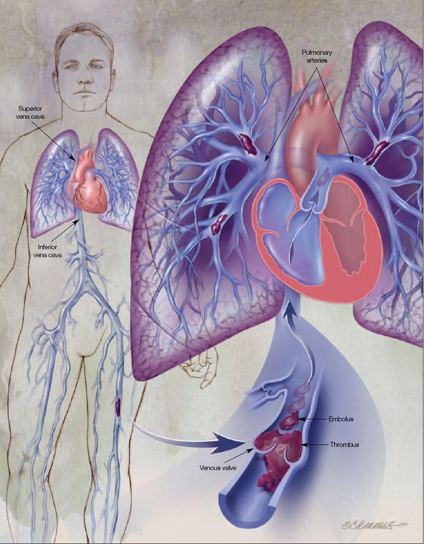 Figure – Pulmonary embolism usually has its origin in deep venous thrombosis of the legs. In the scenario shown here, a thrombus formed in a venous valve pocket above the knee. The embolus traveled to the right side of the heart and then reached the lungs. (Adapted from Tapson VF. N Engl J Med. 2008.3)