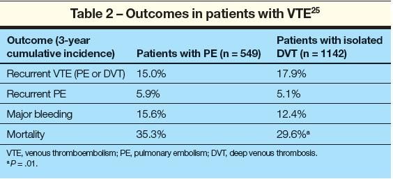 At 1 month, 1 year, and 3 years' follow-up, patients with PE and patients with isolated DVT did not differ significantly with respect to recurrence of PE or overall VTE or the incidence of major bleeding, although the mortality rate was higher in those who initially had PE (Table 2). However, the rates of VTE recurrence and major bleeding were relatively high. The authors say their findings underscore the need to improve anticoagulation strategies for long-term use in the community setting.26