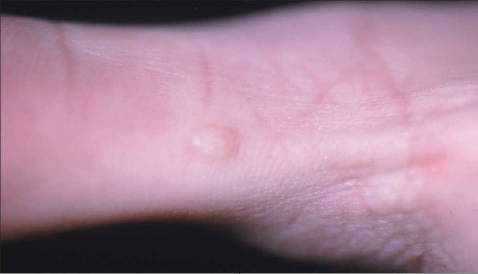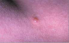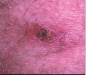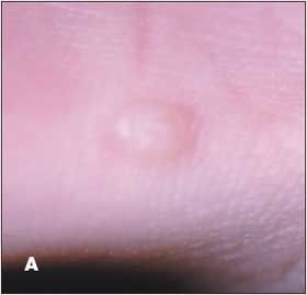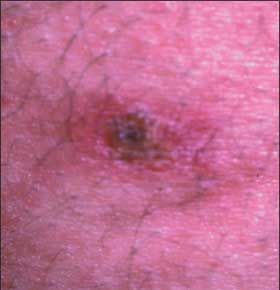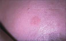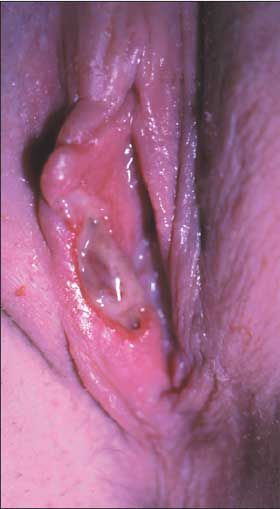ruled out syphilis, which usually starts as an asymptomatic papule that forms an ulcer, or chancre, over several days. Typically, chancroid-a disease seen more commonly in men than in women-presents as a painful pustule that develops into a painful ulcer. Herpes simplex virus infections usually feature grouped vesicles that form tender or pruritic shallow erosions. A factitial lesion is a diagnosis of exclusion. When the diagnosis is in doubt, cultures can rule out infections and a biopsy may be needed.