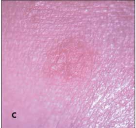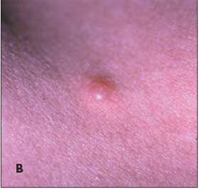 Black widow spiders have a red hourglass shape on the abdomen. Their bites cause severe abdominal pain, cramps, vomiting, and chills-symptoms that are often mistaken for food poisoning. The bite of wolf spiders and orb weavers can produce a local reaction but generally do not cause systemic symptoms. The rash on the patient’s trunk is not typical of Rocky Mountain spotted fever, which is transmitted by wood ticks, or of Lyme disease, which is transmitted by deer ticks. Answers to bonus questions: In this country, brown recluse spiders are endemic in the south and the central midwest.