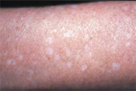 is seen commonly on the forearms and shins of women who are older than 40 years. The condition is attributable to longterm sun exposure. The depigmentation that is characteristic of vitiligo has a predilection for periorifacial and/or genital areas. Tinea versicolor, which is associated with scale, usually arises on the trunk. Some healed factitial lesions feature depigmentation caused by scarring, which was absent on this patient. Cutaneous drug reactions are usually more diffuse than this patient’s rash; in addition, hormone replacement agents are not photosensitizing.