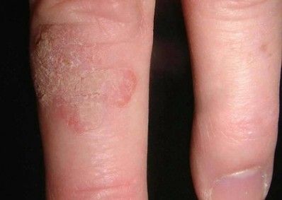 This 58-year-old man was concerned about a dime-sized red, scaly, painless patch on his knuckle. It did not itch or burn; the patient did not habitually rub, pick, or scratch the lesion. There were no similar lesions on either hand; no epitrochlear or axillary adenopathy was detected. The genitalia were free of lesions, and there was no history of genital warts. The patient had a history of basal cell carcinoma on the arm and several more recent actinic keratoses on a balding scalp.