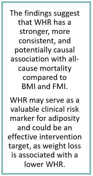 Wait-to-hip ratio (WHR) had a stronger and more consistent association with all-cause and cause-specific mortality than either body mass index (BMI) or fat mass index (FMI), regardless of BMI, according to a study of more than 387 000 individuals, suggesting that a focus on distribution vs mass of adiposity may be a more useful approach for clinical intervention.