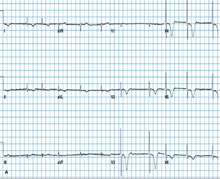 Office ECG findings showed atrial fibrillation with a controlled heart rate. Deep T-wave inversions were noted across the precordium (A), however. The patient was admitted to the hospital. Serial creatine kinase and troponin levels were normal. Warfarin was discontinued and cardiac catheterization was performed once the patient’s international normalized ratio was normal.